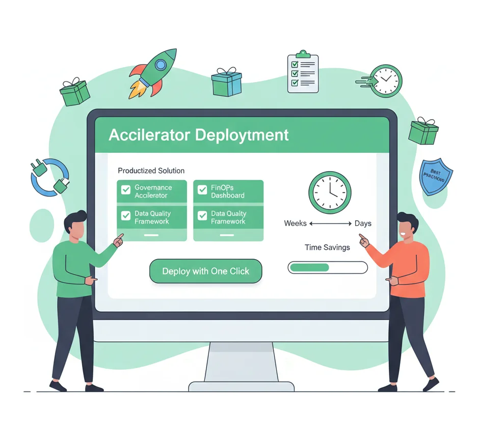 We don’t just build platforms; we accelerate your time-to-value. Our proven frameworks and pre-built accelerators for automated governance and FinOps are based on best practices from dozens of successful implementations, giving you a head start on platform maturity and ROI.